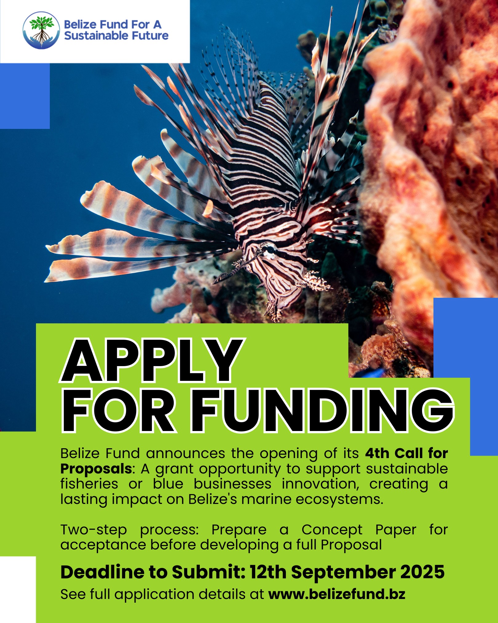 August 25, 2025 News & Events The Belize Fund for a Sustainable Future has opened its 4th Call for Proposals! ????We’re seeking bold, community-rooted, and science-backed ideas under two key themes:  ????Sustainable Fisheries  ????Blue Business Innovation Whether you’re innovating... Read More
